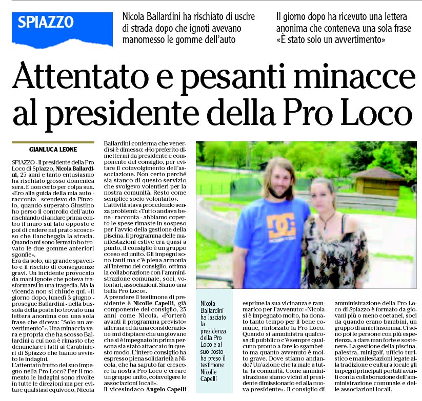 Non riuscira’ mai a comprendere l’amarezza con cui stamani (ieri ndr), aprendo il giornale, ho letto la notizia riguardante il caso di Nicola Ballardini, presidente della Pro Loco di Spiazzo.